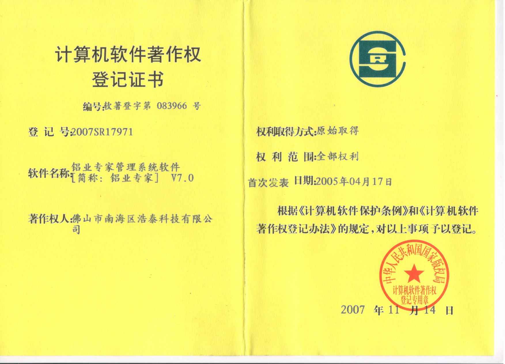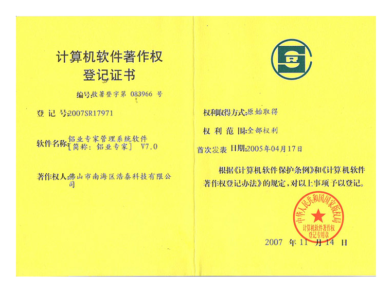 2007年7月1日浩泰《鋁型材信息管理系統(tǒng)》正式定名為《鋁業(yè)專家》。 2007年7月6日,浩泰公司在廣東佛山隆重召開《鋁業(yè)專家V7.0》發(fā)布會(huì),正式發(fā)布《鋁業(yè)專家 V7.0》新產(chǎn)品。 2007年8月,浩泰正式與廣東偉業(yè)鋁廠、廣成鋁業(yè)有限公司、東方鋁材開始了雙方緊密無(wú)間的合作。 2007年11月14日,《鋁業(yè)專家管理系統(tǒng)軟件V7.0》取得了計(jì)算機(jī)軟件著作權(quán)登記證書。 2007年12月,浩泰科技被評(píng)為"07年度佛山最值得消費(fèi)者信賴企業(yè)"。