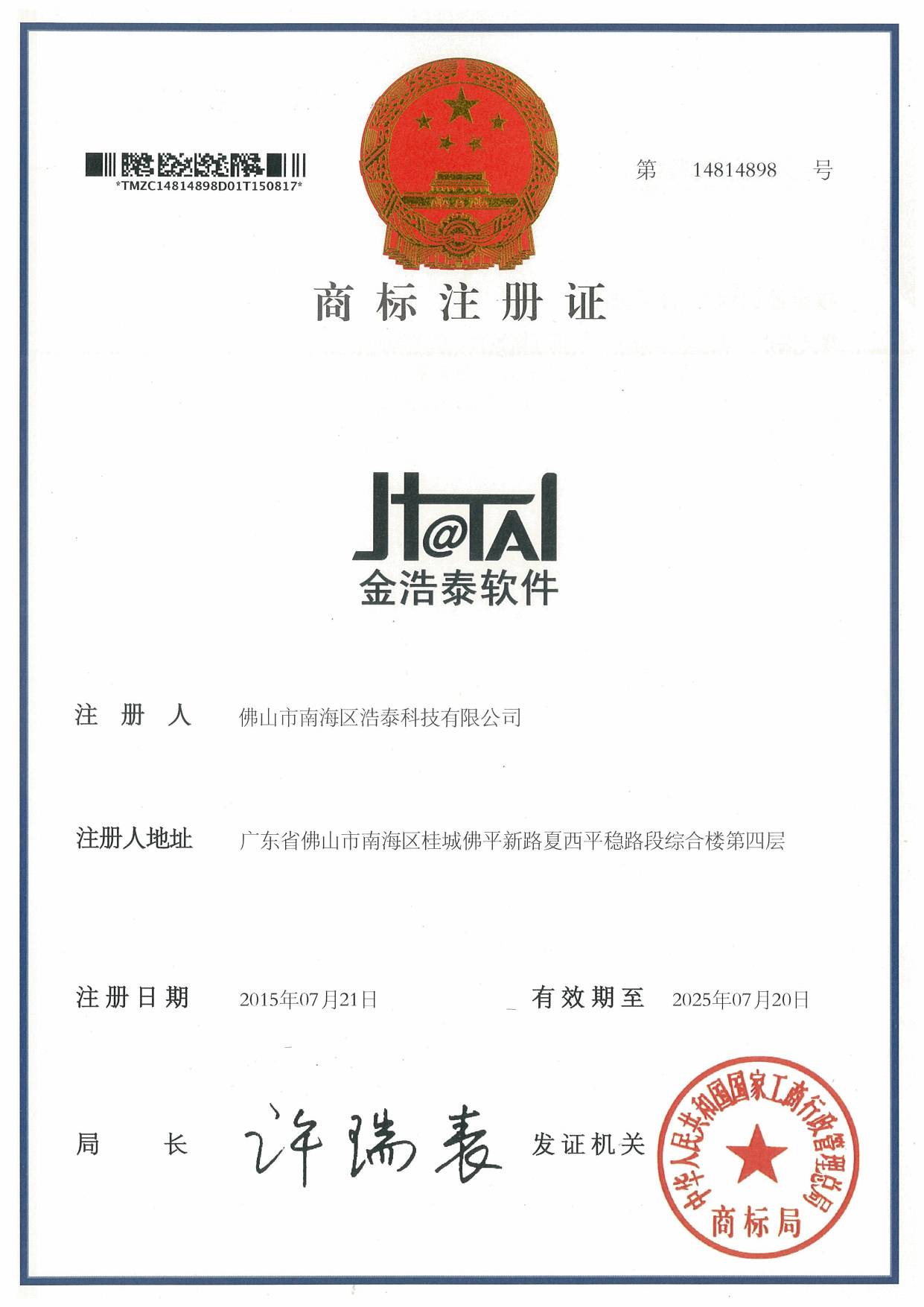 公司喬遷到創(chuàng)越時(shí)代文化創(chuàng)意園,更適合IT金融企業(yè)聚集辦公的園區(qū),標(biāo)志公司再上一臺(tái)階。 浩泰啟航平臺(tái)V1.0,浩泰網(wǎng)上訂單系統(tǒng)V1.0,浩泰企管達(dá)人門窗綜合管理系統(tǒng)V1.0,浩泰鋁棒管理系統(tǒng)V1.0,浩泰財(cái)務(wù)易管理系統(tǒng)V1.0,浩泰圖文信息管理系統(tǒng)V1.0,浩泰E經(jīng)理管理系統(tǒng)V1.0,浩泰模具專家管理系統(tǒng)V1.0,浩泰鋁業(yè)專家管理系統(tǒng)V9.5,浩泰鋁板專家管理系統(tǒng)V1.0 12個(gè)商標(biāo)注冊(cè)成功!