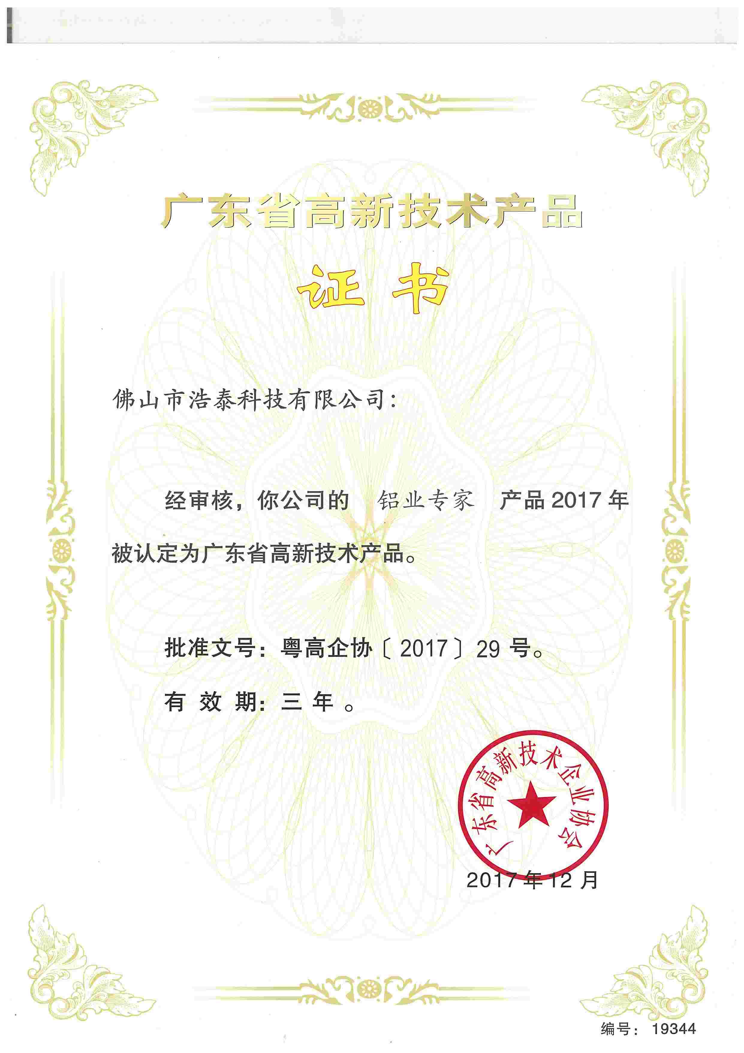鋁業(yè)專家-廣東省高新技術(shù)產(chǎn)品證書